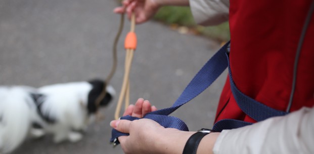 Собака выгуливается в специальной экипировке с надежными карабинами. Поводок крепится на пояс выгульщика, что служит гарантией защиты от побега. На прогулку берется несколько поводков и страхующий ошейник